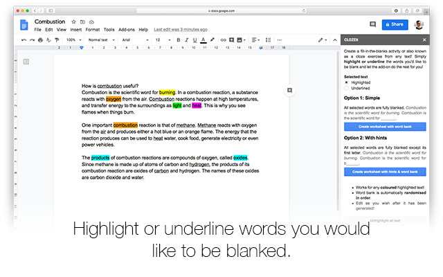 NOTE: If you encountered permission error/issue, most likely because you have multiple Google accounts logged into your browser however this add-on only installed on one of them. A quick fix is to either; log out all others, or install this add-on on your other accounts too. This add-on allows you to make any paragraph text as a fill-in-the-blanks activity, or also known as a cloze activity. How? 1. Simply highlight or underline words you'd like to be blanked. 2. Select between; Option 1 where the words are fully replaced with a blank and a randomised list of those words will be added at the end of the text as a 'word bank'. 3. Or option 2, where the words are fully replaced with a blank except its first letters. This will provide students hints to figure out the rest of the words. The word bank generated at the end of the text is randomised in order. If you wish to start from scratch or made mistakes, click 'Unhighlight all text' to remove any highlight colours. The add-on detects any highlight colours. You can run this how multiple times! If you decide there's more words you wish to be blanked, select them and run it again. You can edit the word bank list at the end if you wish.