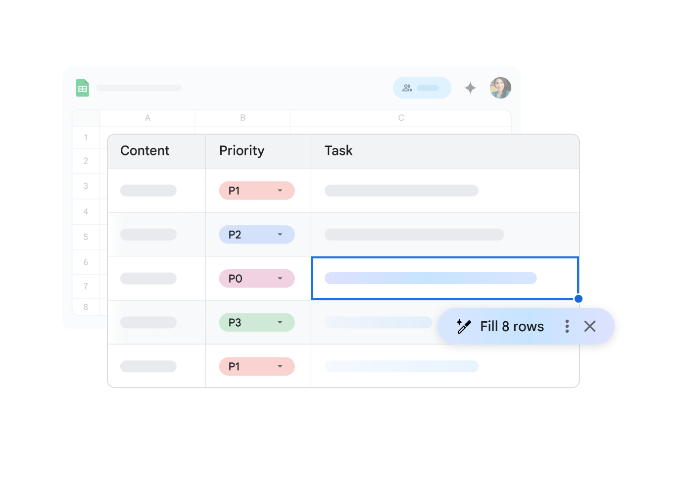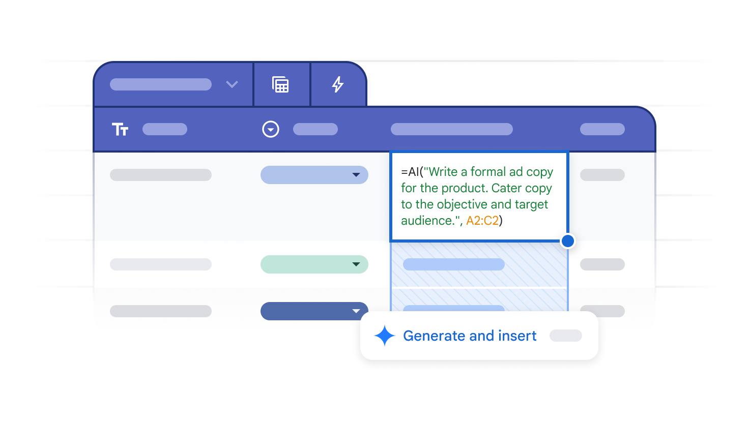 With the AI function, Gemini saves you time by running multiple actions in your spreadsheet at once. From any cell, Gemini will generate, summarize, or categorize text at scale based on your specific instructions.