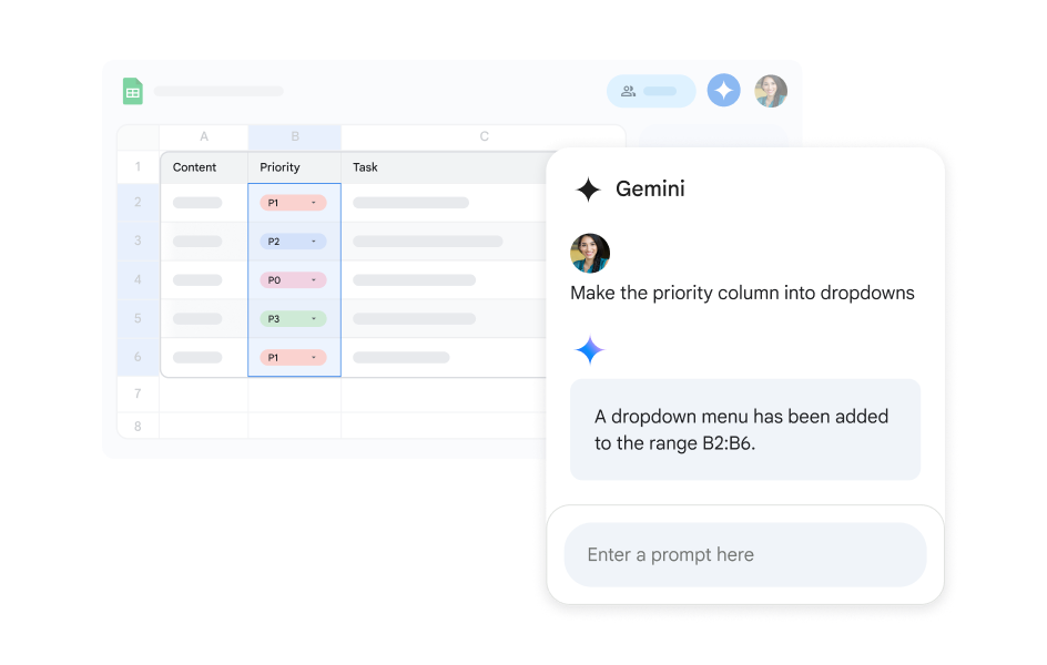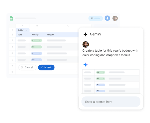 Quickly with Gemini to organize data, plan schedules, or track a project. Use a prompt to generate exactly what you need, fast.
