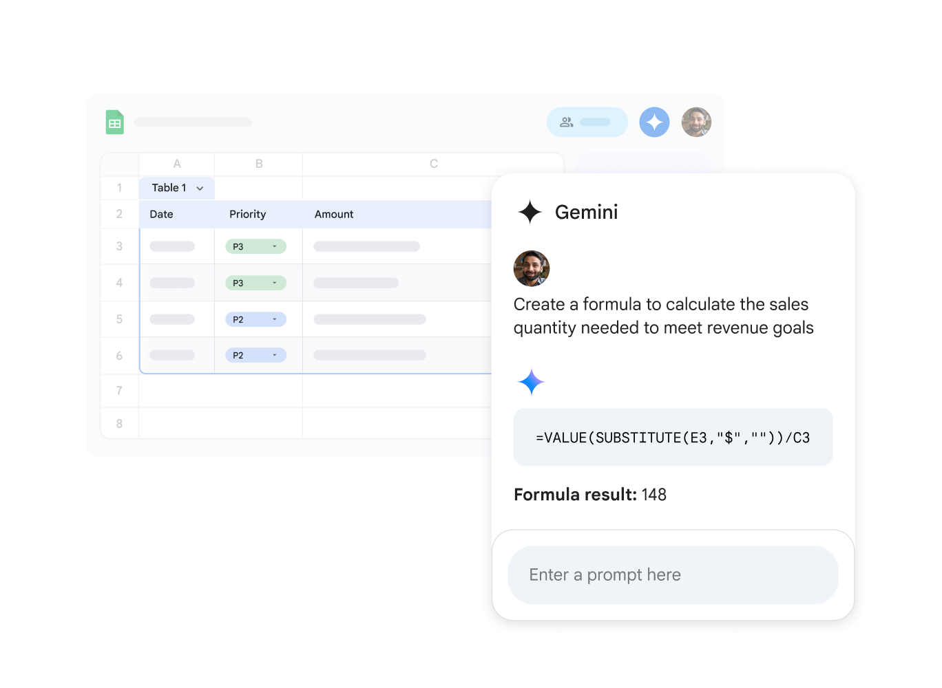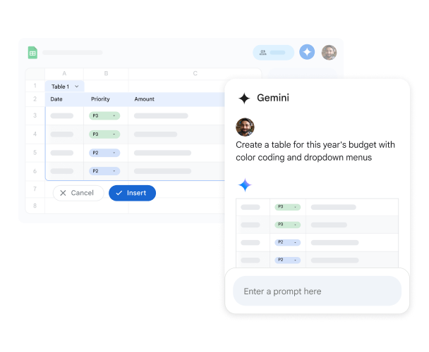 Do more with your spreadsheets in less time with help from AI. Gemini makes it easy to create tables, analyze your data, and more.