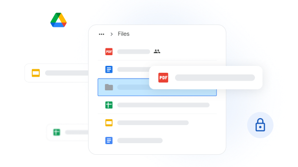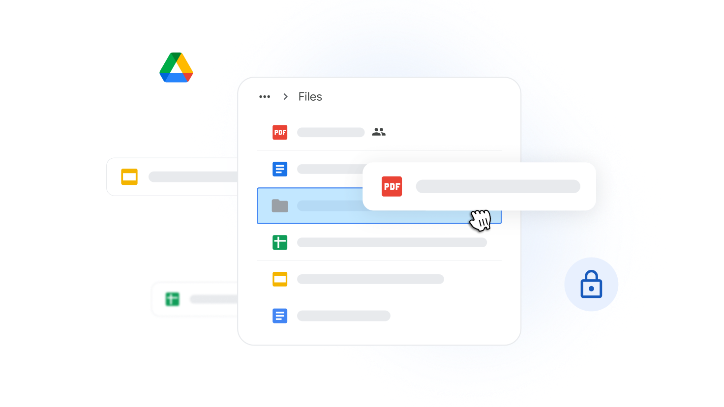 In Google Drive, A cursor drags a PDF document icon over a folder. A blue lock icon is on the right of the screen.