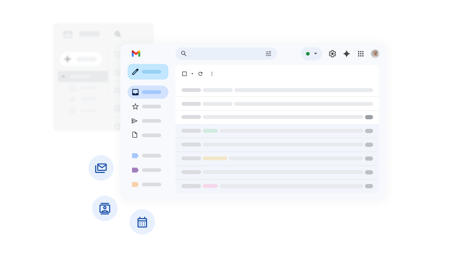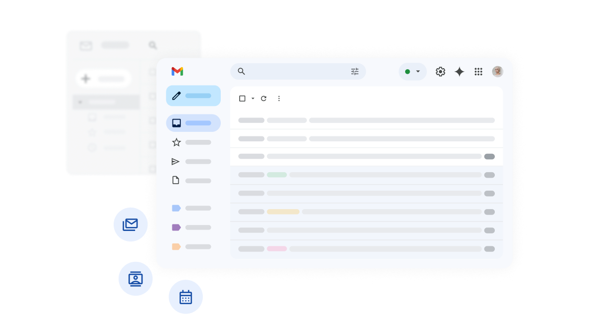 A Gmail inbox with a new email selected and icons for email, images, and a calendar floating below.