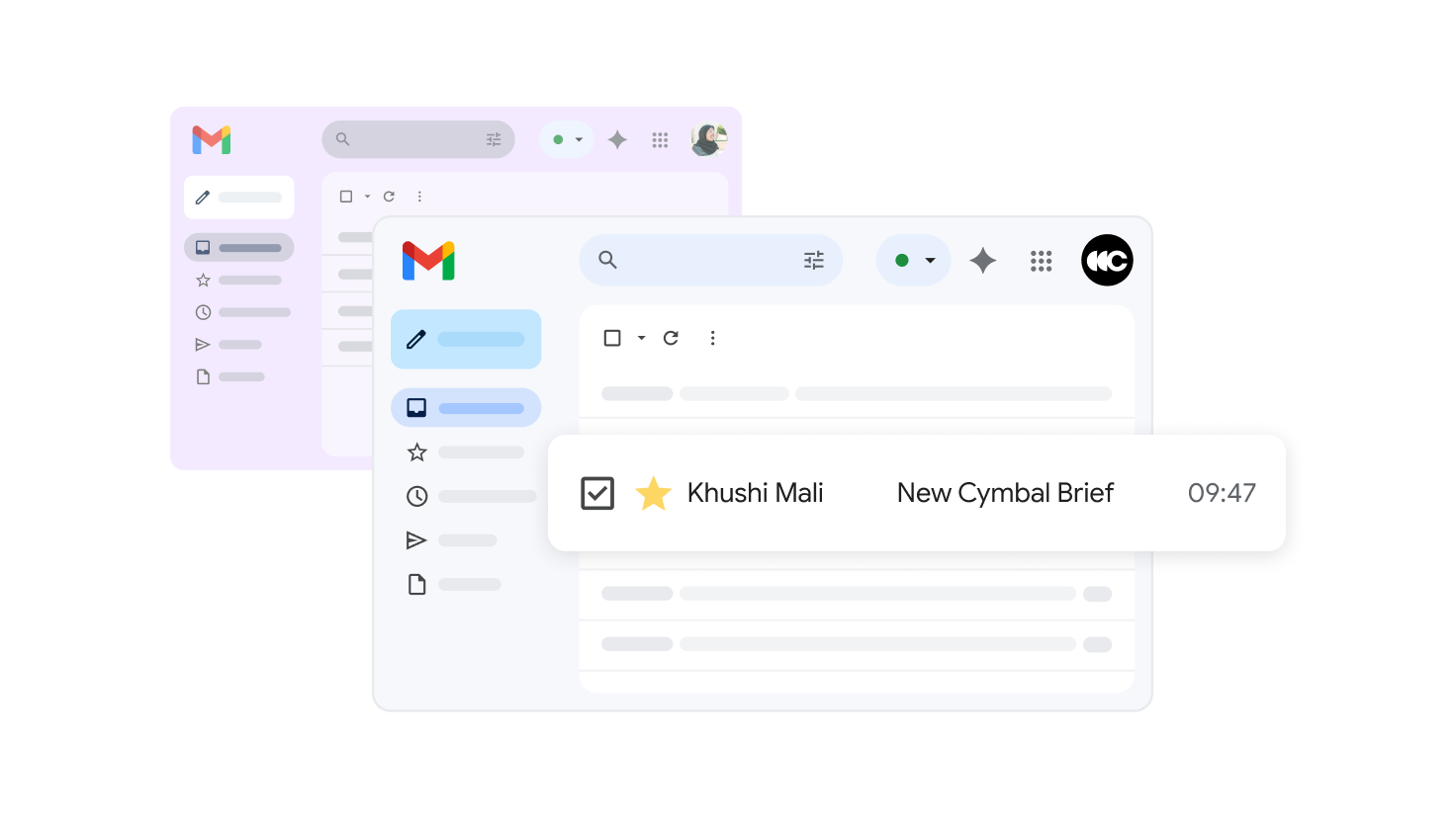 A user has two Gmail windows open, one for personal email and one for business email. The business account shows a work email that has been starred.